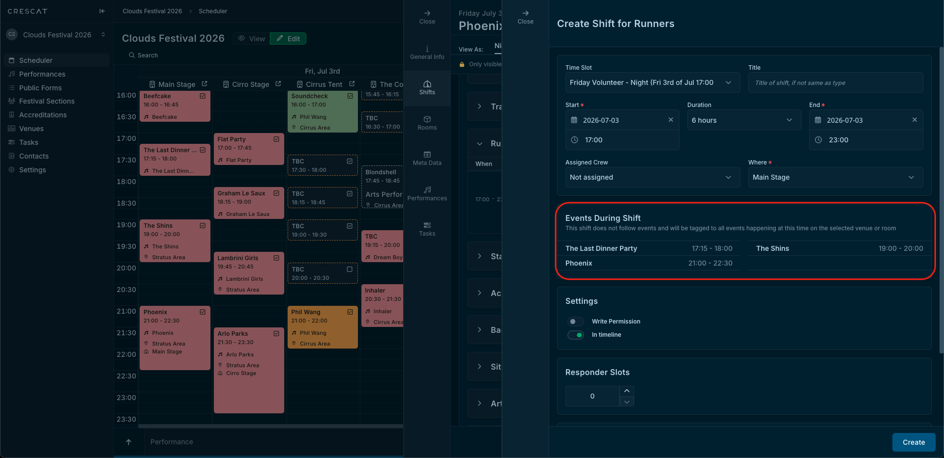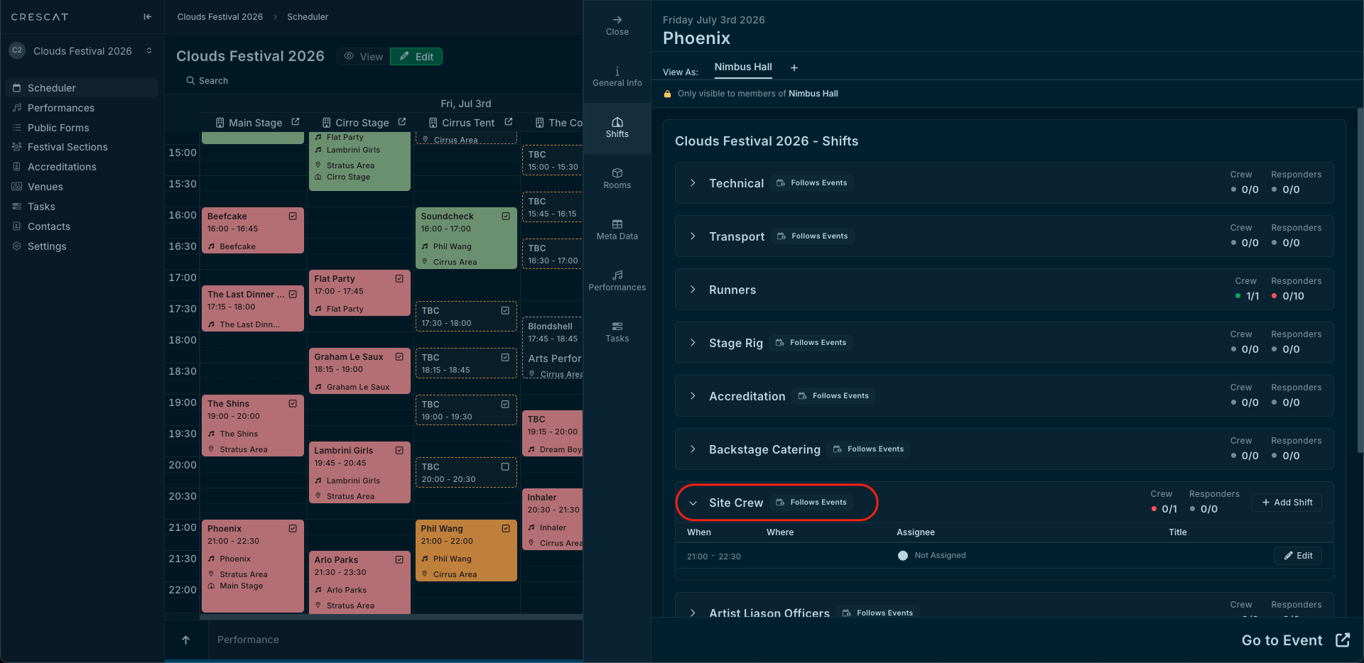 Pro Tip: For an Independent shift to appear, just make sure the event has a venue added. Since the shift isn’t tied to a specific act, Crescat uses the venue to anchor it to the map.