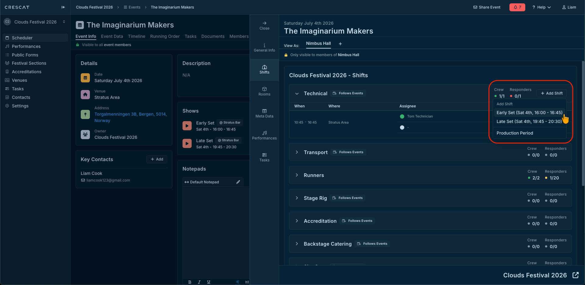 If you're working on an event in your schedule and need to schedule Crew/Volunteers, you no longer have to navigate to Festival Sections to handle your staff that are in Independent sections. You can now add shifts for them directly from the Shifts tab and it will handily show you which events are taking place during the shift..