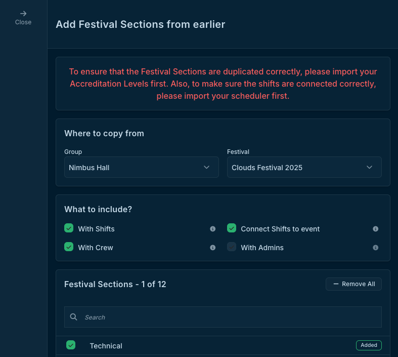 This one cautions us to import Accreditation levels from the relevant festival first if we’d like to completely mirror the other festival’s setup.