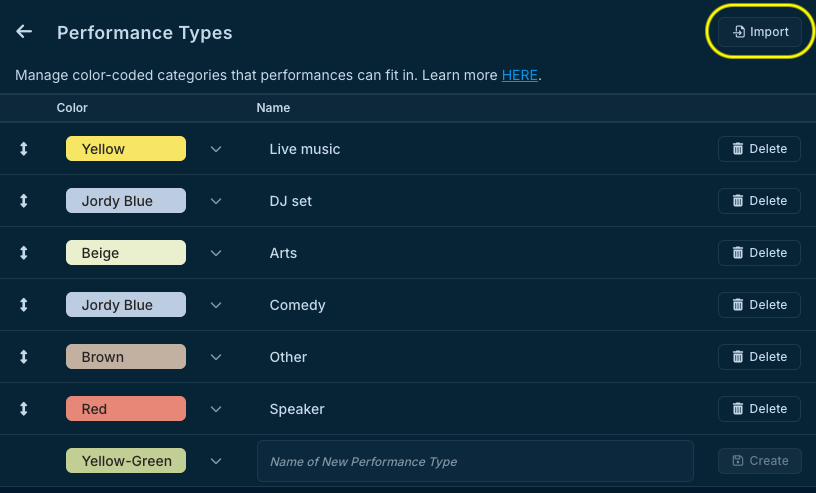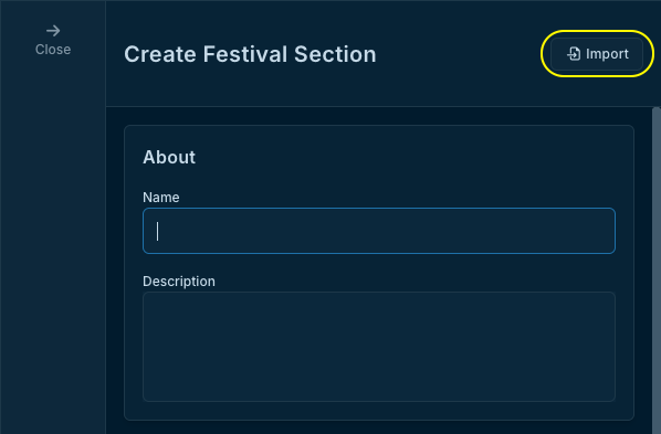 When creating a new Festival Section, you may click Import in the upper right to reuse festival sections from other festivals in your group.