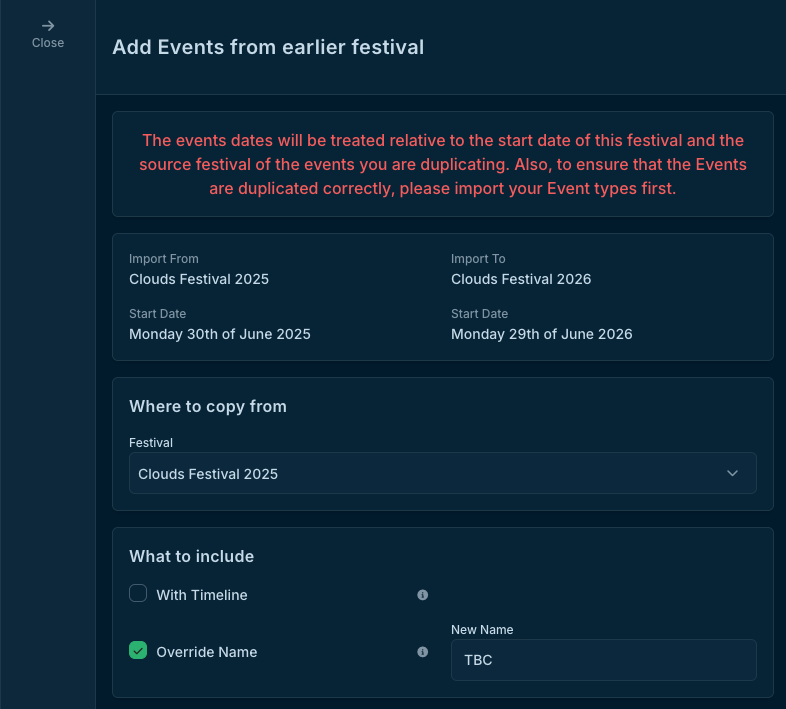 This one allows you to import some or all events from another festival in your group—handy if you will have the same format as last year. You can even override the event’s name with a placeholder of your choice.