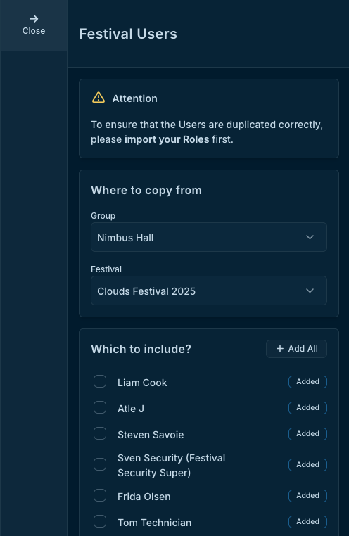 Designed to reduce unexpected results, the slide out warning informs of potential pitfalls before you commit. In the Import Users slide out in the image above, we’re encouraged to import Roles from the related festival first. This lets Crescat add those Roles to the Users on their way into your festival.